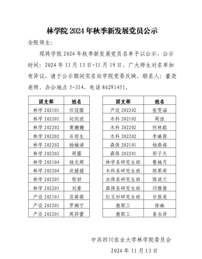 林学院2024年秋季新发展党员公示