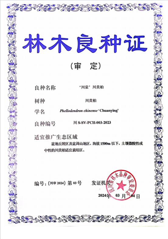 近日,四川省林业和草原局发布公告(2023年第24号),由林学院国家林业草原红豆杉西南工程技术研究中心选育的药用林木新品种“宝兴”厚朴和“川荥”川黄柏通过审定。其中“宝兴”厚朴品种特性为叶大型,新鲜单株树皮产量可达10千克,厚朴酚与和厚朴酚含量高达4.6%-9.2%。“川荥”川黄柏新鲜单株树皮产量可达25千克,盐酸小檗碱含量高达6.0%。两个新品种均具有一定耐干旱特性,较强的抗病虫害能力。