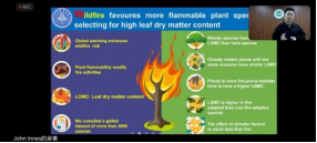 代大川作了题为“Wildfire favoures more flammable plant species by selecting for high leaf dry matter content”的学术演讲,与来自英属哥伦比亚大学、坎特伯雷大学、菲律宾大学、瑞典农业科技大学、孟加拉达卡大学、北京林业大学等全球十余所高校的18名研究生同场竞技,成为最终入围总决赛的9名选手之一。
