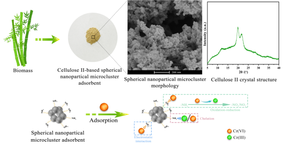 农林生物质的创新利用是助力实现“双碳”目标的有效途径,纤维素作为重要的农林生物质资源,其提取与利用研究一直是农林生物质高值利用领域的前沿热点。近年来,龙8-long8(头号玩家)国际唯一官方网站纤维素的研究多数聚焦于棒状、纤维状纳米纤维素。球状纳米纤维素是一种新型纳米纤维素,具有众多优异的性能,但其合成及利用一直是该领域的难点,鲜有研究报道。该实验组一直围绕“球状纳米纤维素的合成及利用”开展研究,本研究在前期研究成果(Cellulose, 2019, 26:5177,中科院大类Top;Cellulose, 2021, 28:4179,中科院大类Top)的基础上,以竹粉为原料,通过溶解再生、氧化、功能修饰等方法成功设计合成了具有II型纤维素结晶结构的球形纳米颗粒微簇吸附剂,并对吸附剂的成型机理、吸附行为进行了深入探究。吸附剂具有较高的热稳定性和受体位点密度,对水溶液中有毒六价铬表现出良好的吸附性能。研究成果拓宽了纤维素的应用范围,为农林生物质创新利用提供了新的思路与方法。