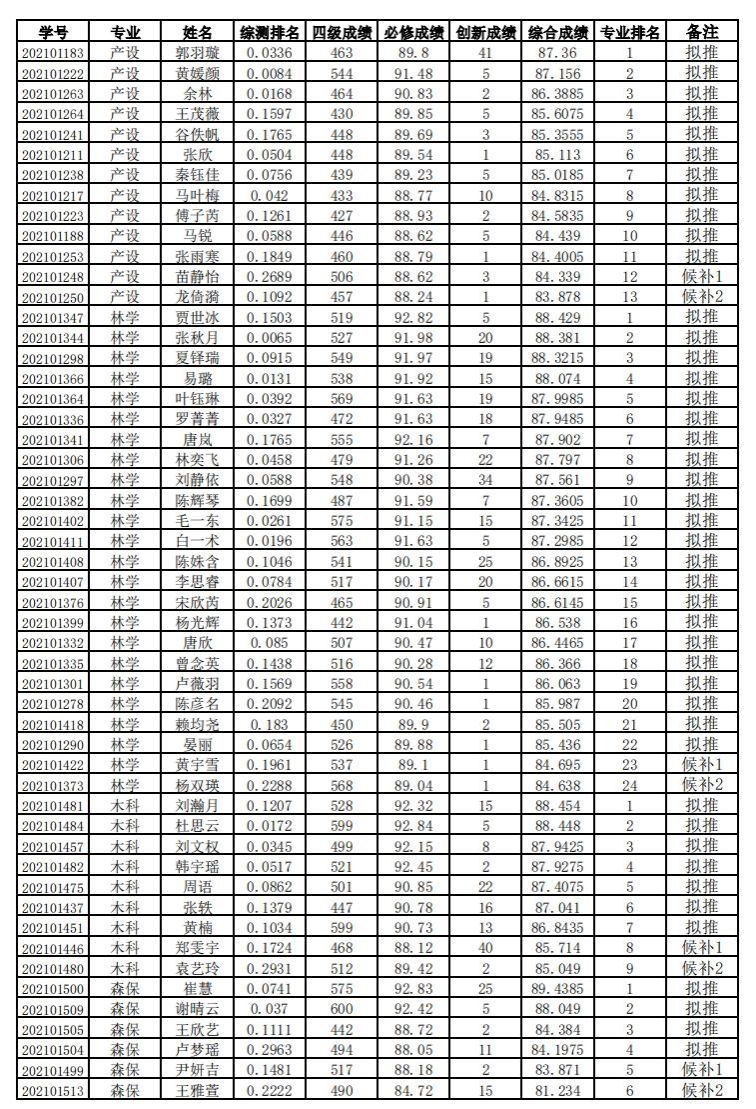 根据《林学院2025年推荐优秀应届本科毕业生免试攻读研究生工作安排》,经学生申请、学院推免工作小组资格审查和评定,现将学院2025年推免名单予以公示,公示时间9月18日至9月26日,广大师生如对名单有异议,请于公示期内实名向学院反映,联系人:董老师,办公地址5-314。