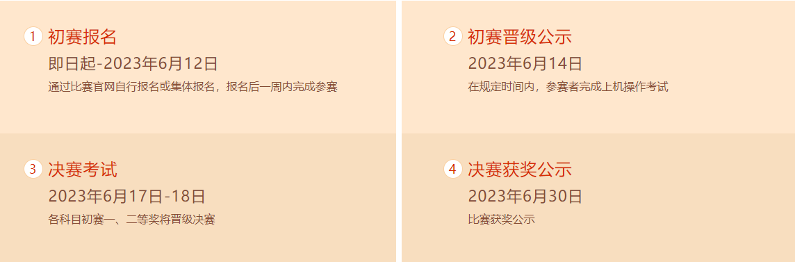 2.参赛选手可选多个科目参赛,每个科目将独立排名和评奖,请合理安排比赛时间。