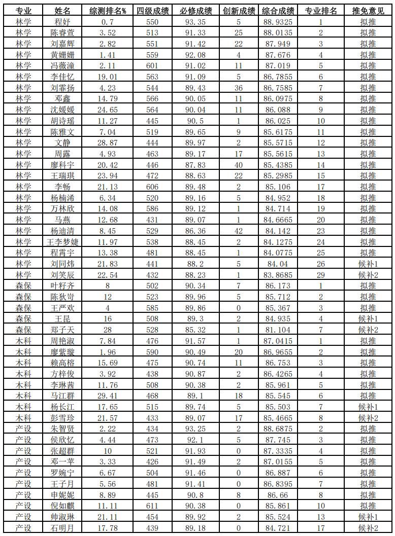 根据《林学院2026年推荐优秀应届本科毕业生免试攻读研究生工作安排》,经学生申请、学院推免工作小组资格审查和评定,现将学院2026年推免名单予以公示,公示时间9月12日至9月18日,广大师生如对名单有异议,请于公示期内实名向学院反映,联系人:董老师,办公地址5-314,电话028-86291451。