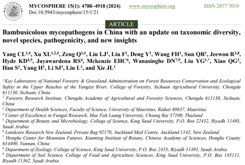 近期,龙8-long8(头号玩家)国际唯一官方网站刘应高/杨春琳课题组联合成都市农林科学院、泰国皇太后大学和毛里求斯大学等单位在真菌学国际权威期刊Mycosphere(IF2023=10)发表题为“Bambusicolous mycopathogens in China with an update on taxonomic diversity, novel species,pathogenicity, and new insights”(中国竹生病原真菌的多样性、新种、致病性和新见解)的研究论文。本文系统全面地整理了中国竹林真菌性病害及其病原,更新并梳理出竹林病原真菌名录,明确了重要竹林病害的发生发展规律,详细介绍1个新属、12个新种,以及11个新纪录种,同时探讨了竹林病害在未来可能的研究方向或趋势。