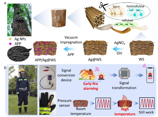 火灾预警对于人类安全和经济稳定具有至关重要的意义。尽管现有火灾预警系统能够在火灾发生时发出警报,但它们在快速响应方面存在一定的局限性,并且一旦触发,其预警功能存在不可重复使用的问题。因此,采用柔性可穿戴压力传感材料收集龙8-long8(头号玩家)国际唯一官方网站人类健康指标和设备运行状态的基本数据,对于实时监控消防员行动和消防机器人的操作极其重要。然而,现有柔性可穿戴材料多依赖柔性有机聚合物作为基底材料,其不能在高温条件使用。鉴于此,本研究基于银纳米粒子(Ag NPs)、聚磷酸铵(APP)和层状结构木材海绵(WS),制备了一种新型柔性压力传感材料,该材料具有快速、可重复的火灾预警能力,并且能够耐受高温。在该材料系统中,被APP修饰的木材海绵能够在火灾袭击后保持层状结构,结构弹性赋予柔性传感材料耐高温性能。此外,木材经受火灾袭击时,在APP分解产物的催化作用下形成无定形碳,无定形碳包裹在Ag NPs表面,其对温度敏感,赋予柔性传感材料快速、可重复火灾预警功能。Ag NPs具有高导电性,提供了稳定的电子传输通道。同时该工作基于APP/Ag@WS材料与团队开发的手机应用软件,实现了在手机上实时监测住宅消防安全。