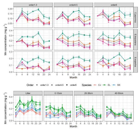 总的来说,该研究有力地表明,根Mn浓度(无论是在初始还是其他分解阶段)与质量残留率的相关性比氮、磷、浓缩单宁或总酚的传统预测因子要一致得多。根Mn浓度极大地指示了土壤层、根序和物种的根分解率。根系初始Mn浓度和分解环境的Mn供应能力共同控制着整个分解过程中的根系分解速率。