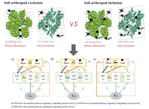 凋落物分解的实质是由土壤碎屑食物网生物群落驱动的酶促生物化学降解过程。土壤节肢动物可通过破碎、搬运和肠道消化酶的直接作用以及调节微生物群落结构和活性的间接作用影响凋落物分解。同时,胞外酶活性(EEAs)和生态酶化学计量作为预测微生物营养利用策略与有机物转化率的重要指标也得到广泛关注。目前,虽然亚高山森林中土壤节肢动物与胞外酶活性及凋落物分解速率之间的密切关系已被证实,但基质质量如何影响凋落物分解过程中土壤节肢动物对酶活性的贡献尚不清晰。因此,森林生态与管理团队科研人员借助“高山森林生态系统定位研究站”野外试验平台,设置土壤节肢动物控制试验,连续2年研究了岷江冷杉(Abies faxoniana)和红桦(Betula albosinensis)凋落物分解过程中土壤节肢动物对胞外酶活性的影响。结果发现:(1)土壤节肢动物参与提升了凋落物分解过程中的EEAs,并缓解了由凋落叶基质质量变化引起的EEAs差异;(2)凋落物分解过程中EEAs存在潜在的碳和磷限制,土壤节肢动物参与缓解了碳限制,它们通过调节凋落物中碳含量和化学计量比(如氮磷比、木质素氮比和碳磷比)间接促进了与凋落物碳氮磷降解相关的胞外酶活性。该研究结果为有助于深入认识亚高山森林生态系统碳和养分循环过程。