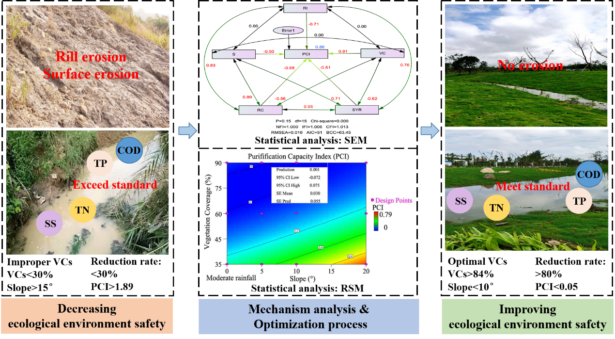 降雨过程中由水土流失引起的非点源污染是一个重要的水文与环境安全问题,一直备受全球生态水文与环境安全保护领域学者的广泛关注。近日,李贤伟教授团队侯贵荣博士(后)在国际环境科学与生态学TOP期刊《生态毒理学与环境安全》(Ecotoxicology and Environmental Safety,IF=7.129)在线发表了题为《水土保持功能为导向确定的适宜植被覆盖度和种植坡度可有效防止面源污染扩散——以草地为例》(Suitable coverage and slope guided by soil and water conservation can prevent non-point source pollution diffusion: A case study of grassland)的研究论文。该论文第一作者、通讯作者及第一完成单位均为四川农业大学,该研究得到了中国博士后科学基金项目资助(2021M692330)。