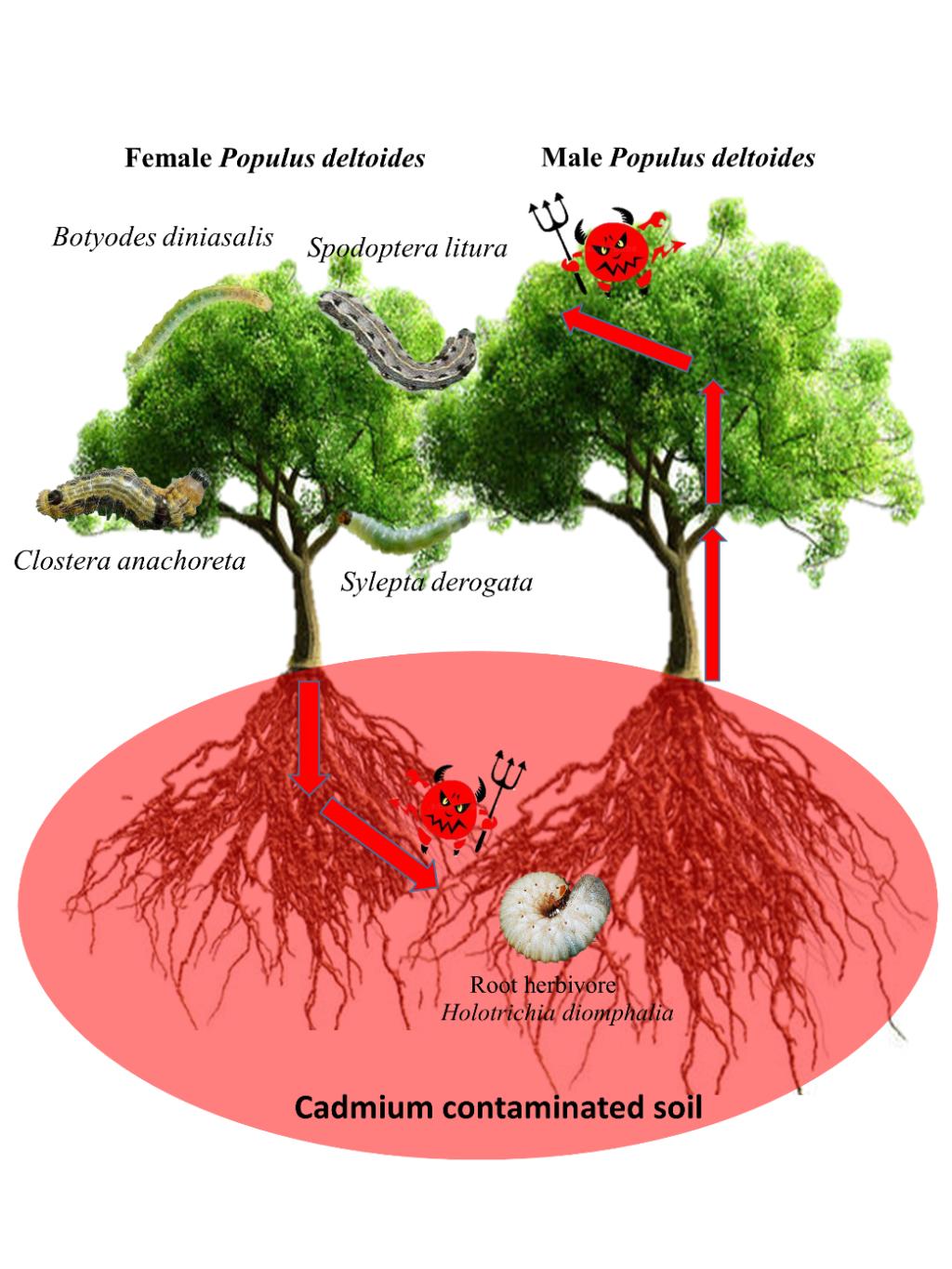 为了验证该假说,本项目拟采用亲本一致的美洲黑杨雌雄植株作为研究材料,通过测试土壤镉处理下美洲黑杨雌雄植株对四种食叶害虫(包括两种专食性昆虫和两种广食性昆虫)和一种地下害虫(蛴螬)幼虫的生长发育和取食选择的影响,探究了镉胁迫下不同性别杨树植株间的抗虫性差异及导致该差异的原因。研究结果发现,镉处理下杨树雄性植株可以显著抑制四种食叶害虫的生长发育和取食选择,而雌性植株则明显降低了地下害虫蛴螬的生长量。在随后的基因表达测试中,研究人员通过荧光定量PCR的方法检测了16个在植株叶片和根系内参与镉积累,转运和解毒的相关基因,发现在镉胁迫下雄株叶片中和雌株根系中的基因上调数量较多,这也解释了为什么本研究发现杨树雄株叶片和雌株根系比另一性别富集的镉更多。因此,研究人员推测雌雄植株这一抗虫性差异可能是由于雌雄植株在叶片和根系中镉富集量的差异性所导致。