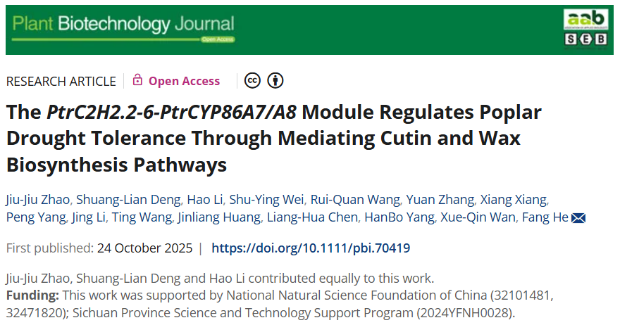 当杨树遭遇干旱时,它如何通过自身的"护肤系统"锁水保命?近日,我院林木遗传育种团队在植物学知名期刊《Plant Biotechnology Journal》(影响因子12.4)上发表了最新研究成果,揭示了杨树应对干旱胁迫的新型分子机制,为林木抗旱育种提供了重要的理论依据和基因资源。
